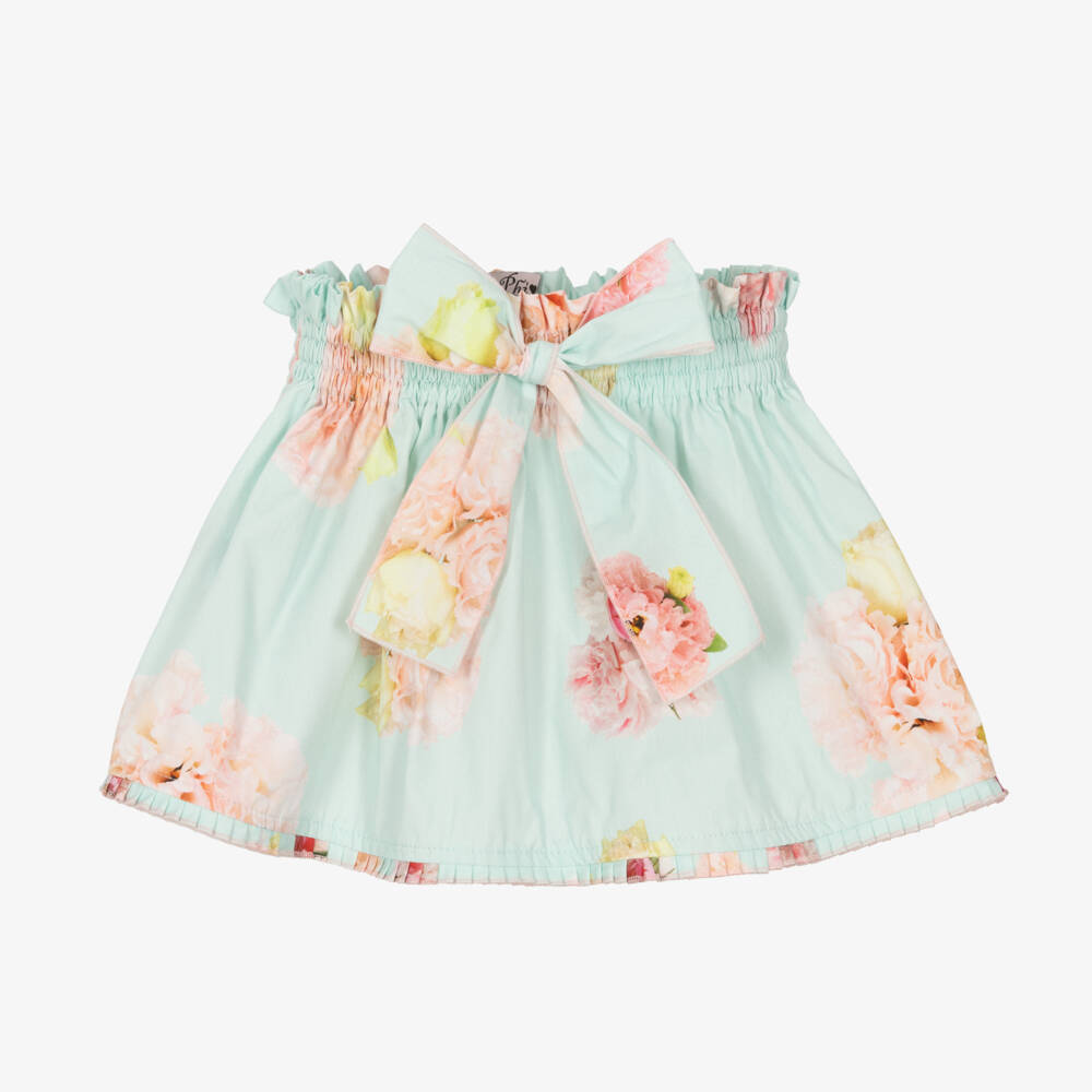 Blue skirt for girls by Phi Clothing, made in soft and lightweight cotton poplin. It has a pretty pink and yellow floral pattern, with a pleated trim around the hem. It has an elasticated waistband for a comfortable fit with a large fixed bow on the front.