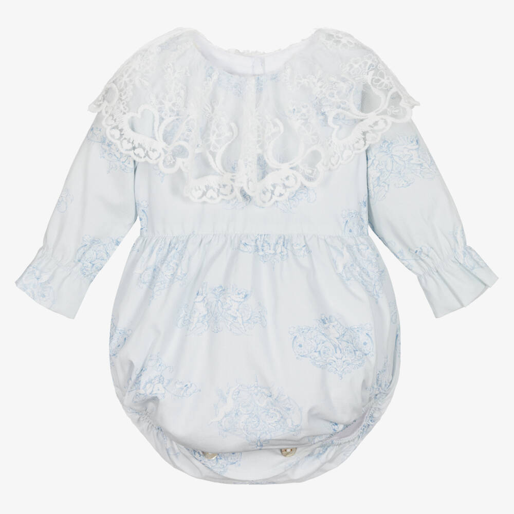 Pretty pale blue cotton shortie for little girls by Portuguese brand Phi Clothing, with a sweet cherub pattern. Made in soft poplin, it has an eye-catching, white, scalloped lace ruffle around the neck and frilled, gently elasticated sleeve cuffs. Gathered and full below the waist, it fastens with pretty, mother-of-pearl buttons on the back and between the legs. It is fully lined in soft cotton voile for comfort.