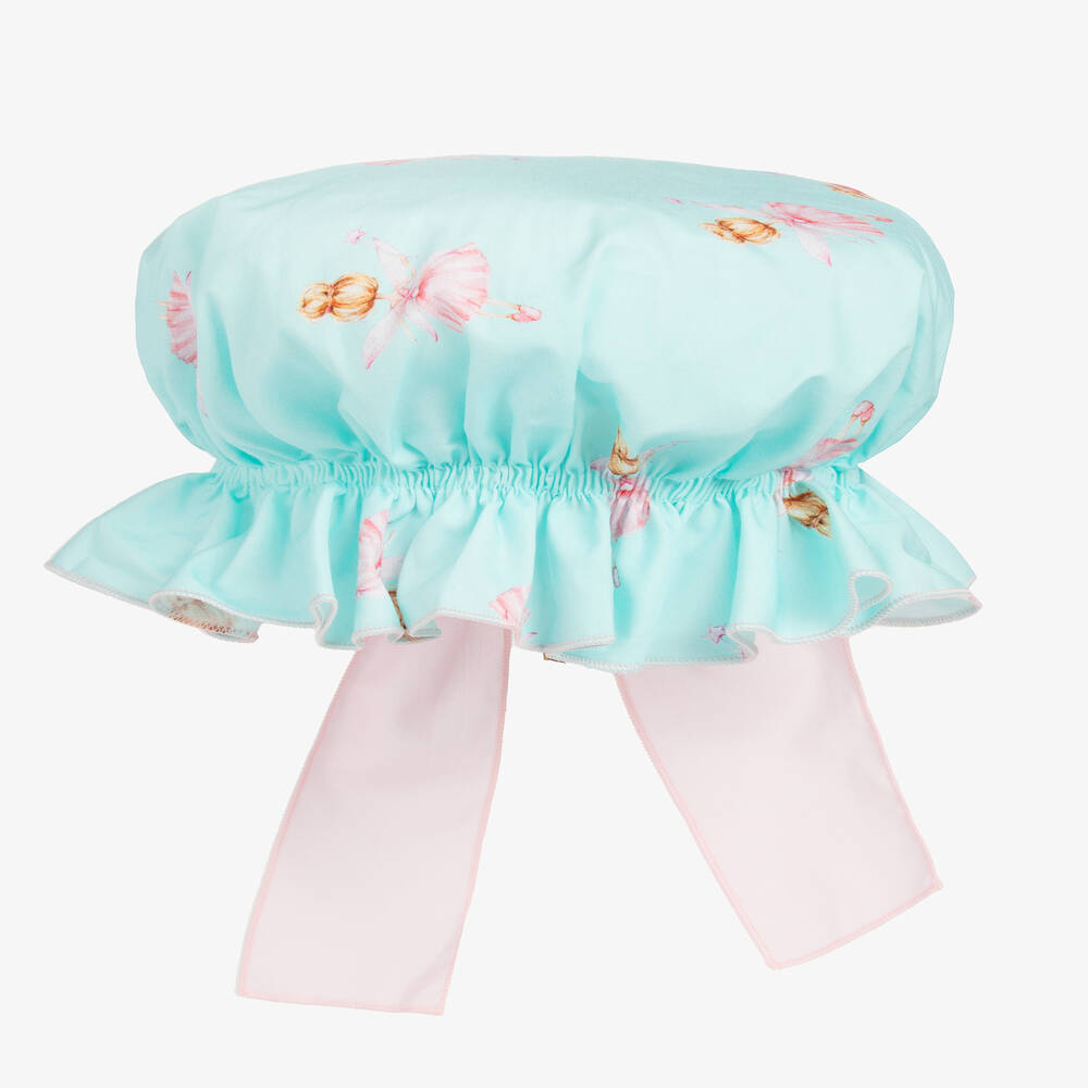 A turquoise blue classic mop hat for younger girls by Phi Clothing, made from soft cotton. This lightweight hat has a cute contrasting pink ballerinas print all over and elasticated rim for comfort. An oversized pink bow on the back finishes this look with a romantic touch.