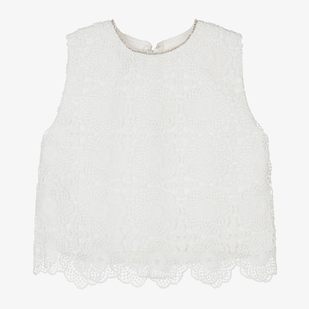 Phi Clothing designs this ivory sleeveless blouse for girls. Woven in a double layer of soft and lightweight cotton, this gorgeous top has a delicate floral guipure lace overlay. The round neckline is trimmed with glittering diamanté for added sparkle. With a keyhole detail at the top, the back has a tie-up grosgrain ribbon fastening and two further decorative bows.