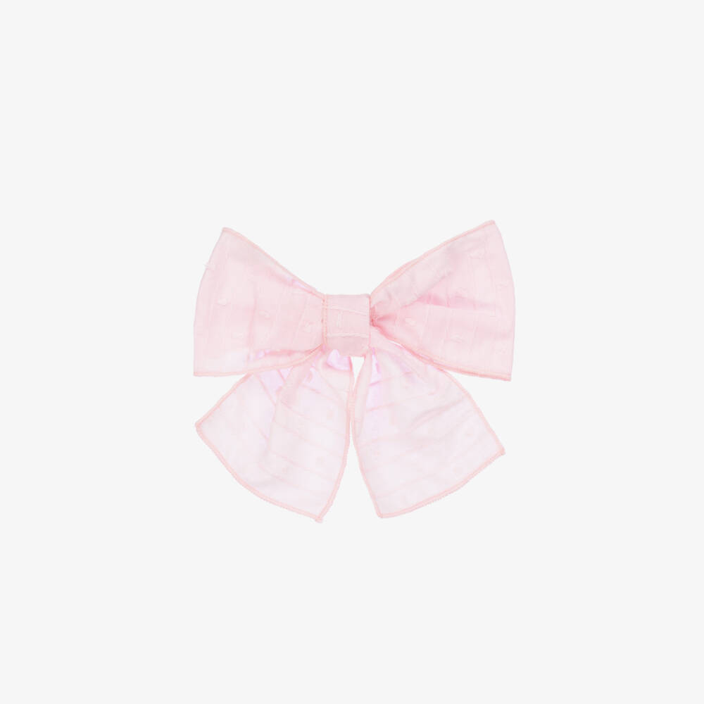 Pink bow hair clip for girls by Phi Clothing, woven in lightweight plumeti cotton with embroidered stripe detailing. A lovely finishing touch to any outfit, the bow is set on a metal crocodile clip that slides securely in the hair.
