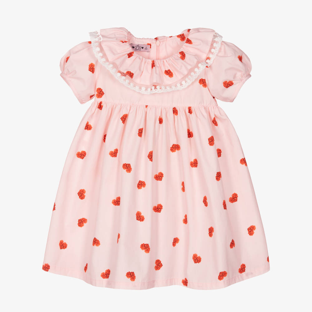 Pink dress for girls by Phi Clothing, made in soft, lightweight cotton poplin. Patterned with a pretty floral heart pattern, it has a full skirt and sweet puffed short sleeves. There is a ruffle collar with a lacy embroidered tulle trim and a concealed zip fastening on the back.