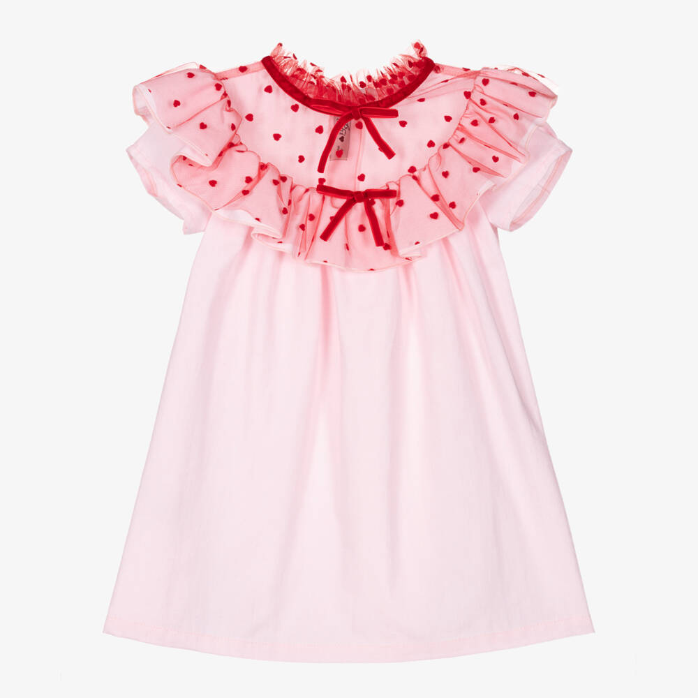 Pretty pink A-line dress for girls by Phi Clothing, woven in lightweight cotton. This lovely dress has a high frilled neckline made in fine tulle, with red velvet bows and sweet red hearts. It fastens with buttons on the back for a classic finish.
