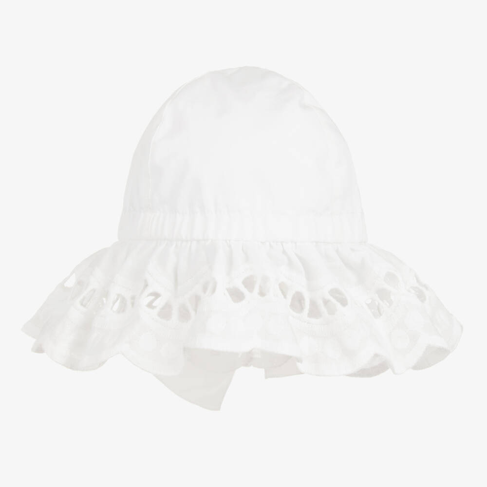 A beautiful white cotton poplin sun hat for younger girls from Phi Clothing. Timeless and elegant, it has a wide scalloped brim made from gorgeous broderie anglaise. Soft and lightweight, it is gently elasticated around the brim and has a pretty bow to tie on the back.