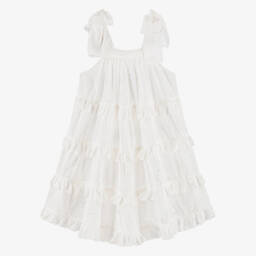 White cropped top for girls by Phi Clothing. This sleeveless design is made in a soft and comfortable cotton. Shirred for shape, it has tie-up bows on the shoulder straps and gathered ruffles for a sweet look.