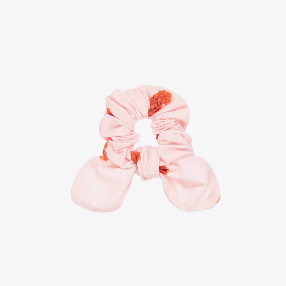 Ideal for accessorizing an outfit, this light pink scrunchie for girls is by Phi Clothing. It has a red floral heart print and a knotted bow detail. Super stretchy, it is made from smooth cotton that doesn't snag the hair.