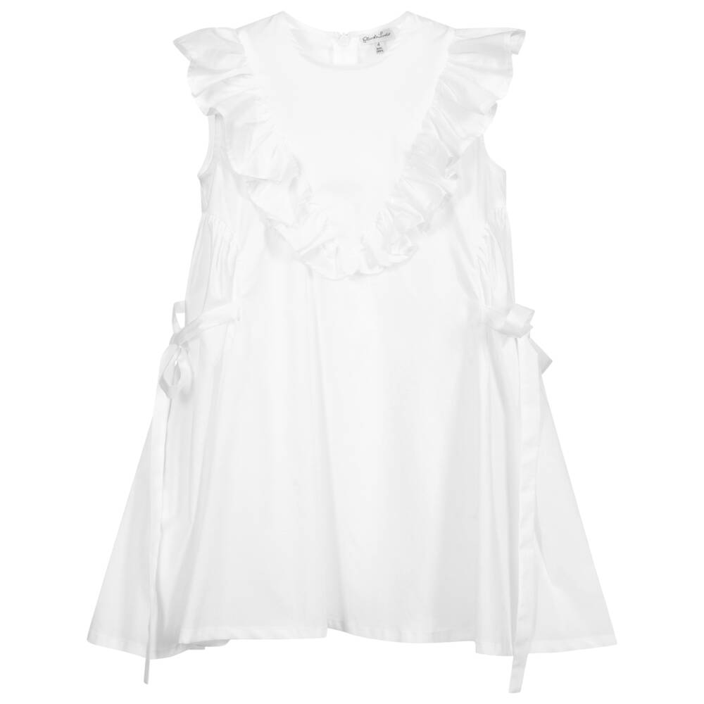 A lovely white dress for girls by Piccola Ludo, made in soft lightweight cotton. It has a pretty ruffles on the back and front, with ribbon ties on the sides.