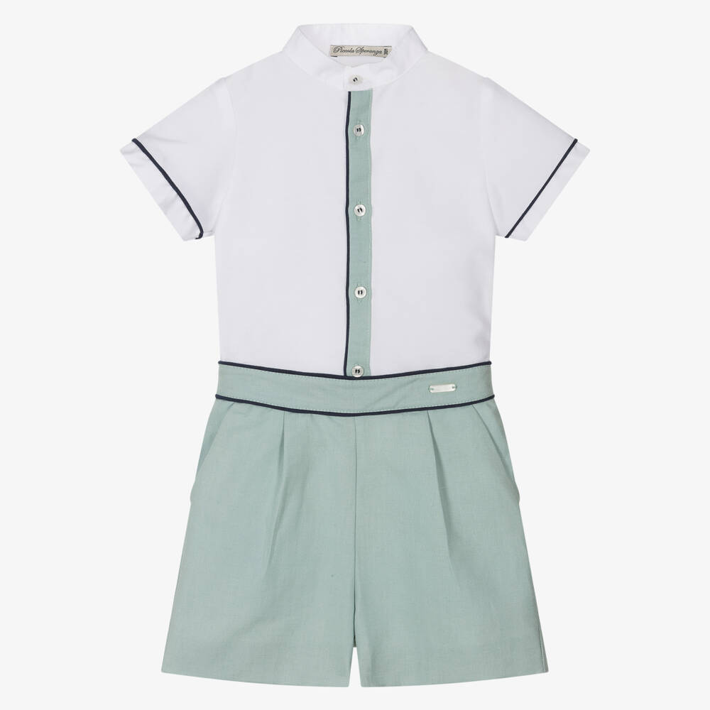 A smart white shirt and green shorts set for younger boys by Piccola Speranza. The cotton-blend, collarless shirt has a green button-fastening placket and navy blue piping trim. It pairs with coordinating shorts that have pleats and pockets on the front and a comfortable lightweight lining. The waistband has piping trim and is elasticated around the back for easy pull-on.