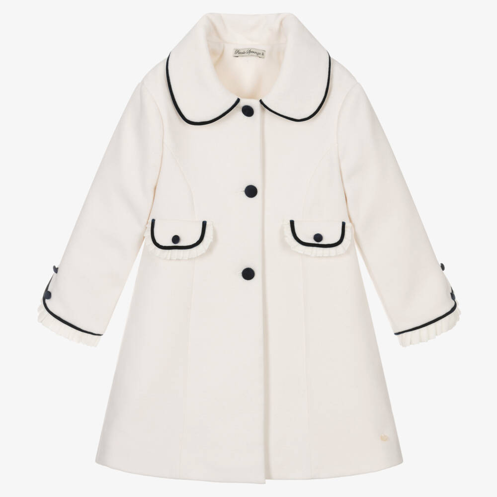 A smart ivory coat for girls by Piccola Speranza, made from beautifully soft fabric with a felted feel. Traditionally styled, this warm layer has a collared neckline with dark navy blue velvet trims. This coordinates with the front button fastenings and faux front pockets for a neat finish. There are decorative buttons and pleated velvet trims on the cuffs, as well as a pearlescent logo disc above the hem. It has a silky smooth lining and a single back vent to allow for movement.