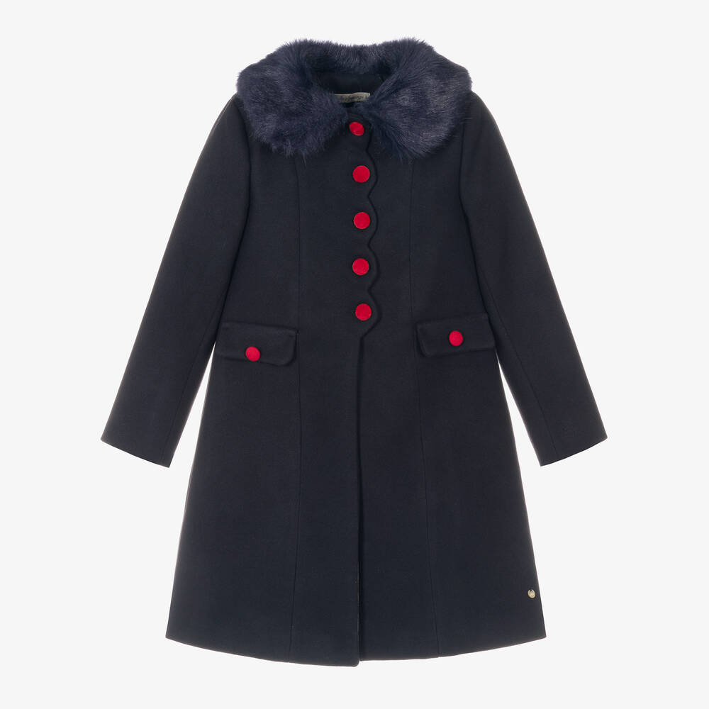 A smart navy blue coat for girls by Piccola Speranza, made in beautifully soft fabric with a felted feel. A traditional look with a gentle A-line shape, it has faux front pockets and contrasting red velvet-covered buttons, with lovely scalloped detail along the placket. A gorgeous faux fur collar adds a glamorous touch, together with the floral-patterned satin lining. The Portuguese label's mother-of-pearl logo disc can be seen on the front for a discreet designer finish.