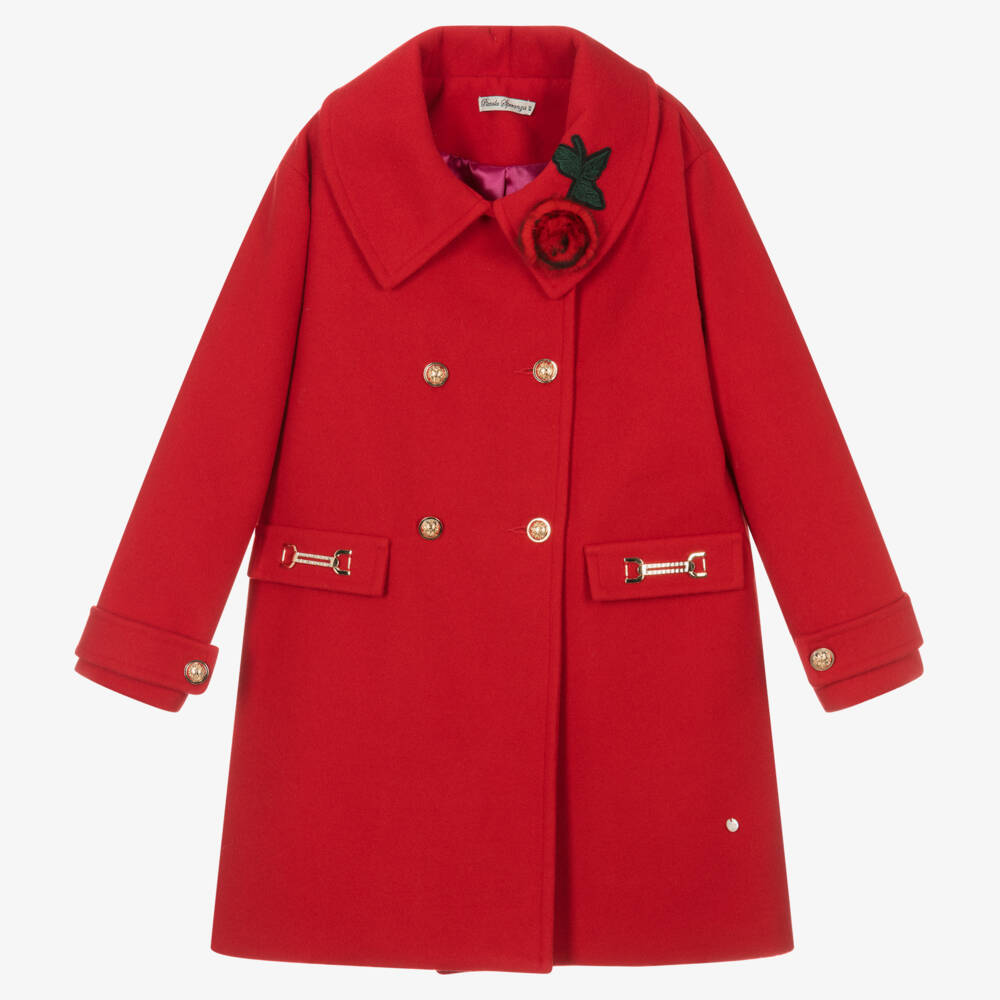 Smart red double-breasted coat for girls by Piccola Speranza, made in a soft felted mid-weight fabric. This traditionally styled coat fastens at the front with shiny gold buttons and has gold decorative metal charms with diamanté detailing, on the faux pocket flaps. It has a 3D soft faux fur flower appliqué on the collar for a stylish finish. This lovely coat is fully lined in a silky purple lining for comfort.