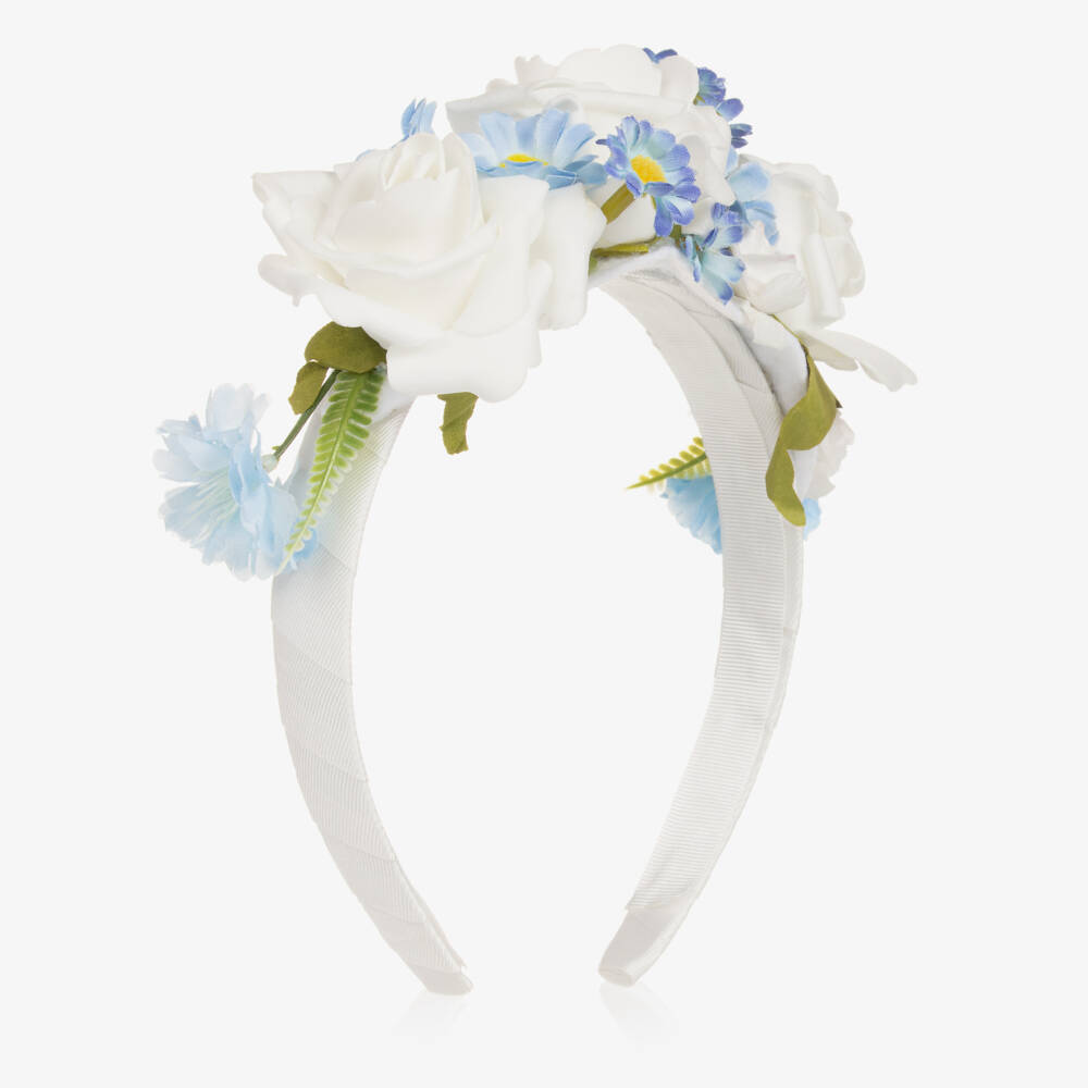 Sweet and charming, this white and blue hairband for girls is by Piccola Speranza. For a delightfully feminine look, it has rose and flower embellishments across the top in the style of a flower crown. A beautiful way to keep hair out of the face, the comfortable flexible band is covered with smooth grosgrain ribbon.