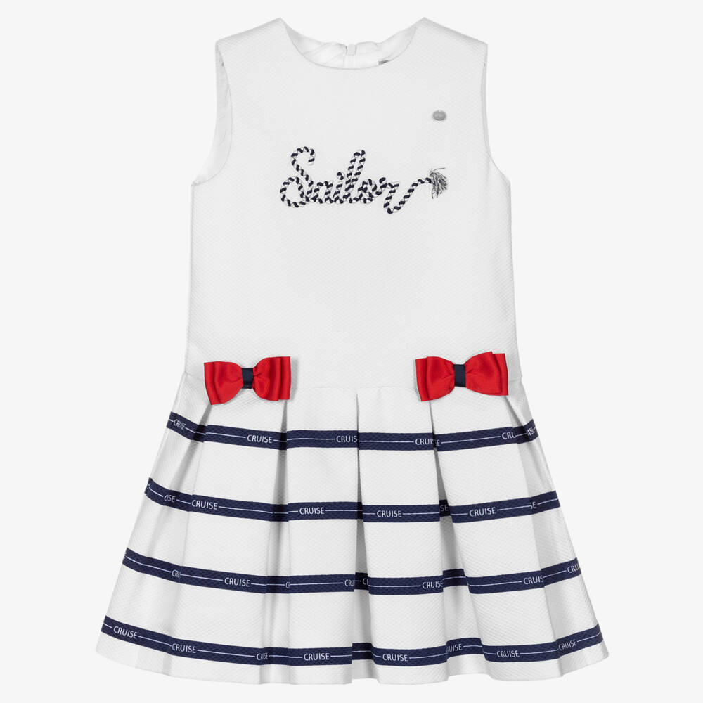A white nautical-inspired dress for girls by Piccola Speranza. The pleated skirt is patterned in navy blue 'cruise' stripes', trimmed with red grosgrain bows at the waist. The word 'sailor' is featured on the bodice in navy blue and white rope embroidery. This lovely traditional style dress is woven in a softly textured cotton blend and is fully lined in cotton voile for comfort. It fastens discreetly with a concealed zip on the back.