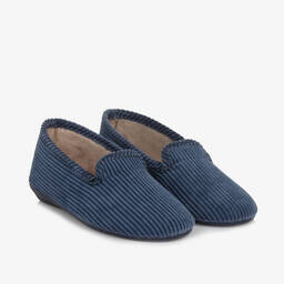 Blue corduroy slippers for boys and girls by Spanish brand Pisamonas. Comfortable and cosy, they are lined in soft velour and have non-slip rubber outer soles. This causal style simply slips on.