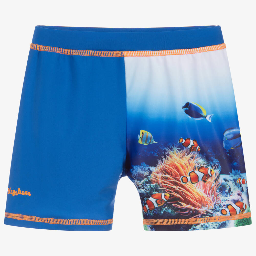 Little boys bright blue swim shorts by Playshoes, with UPF 50+. Great to wear by the pool or on the beach, they have a stretchy jersey front lining for comfort, an elasticated, drawstring waist, and a fun under the sea fish print with contrast orange stitching. The trunks come in the form of a swim nappy up to size 1-2 years.