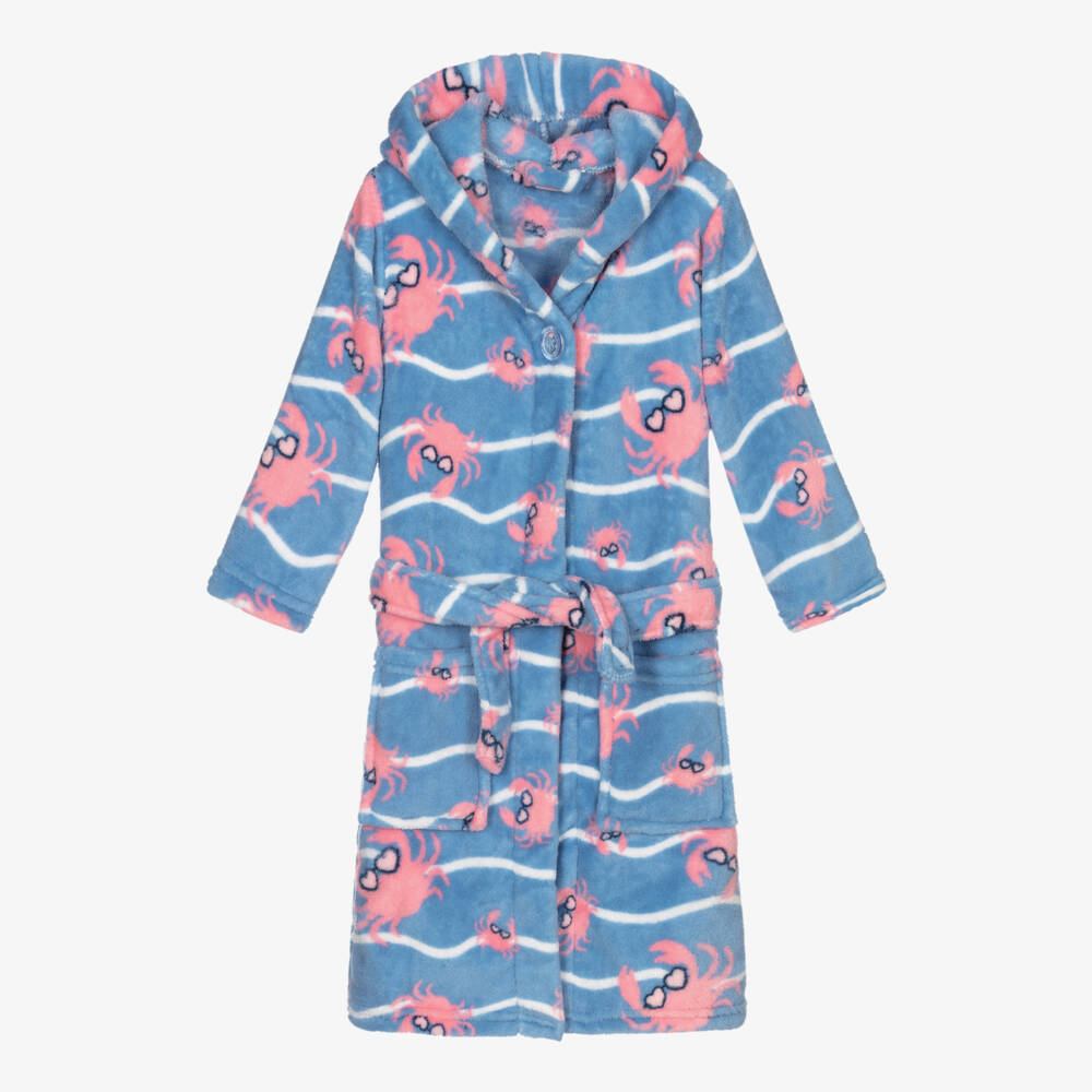 Hooded blue dressing gown for girls by Playshoes, made in mid-weight fleece with a pink crab print. It has two pockets on the front, a tie belt around the waist and fastens with a large button on the neck.