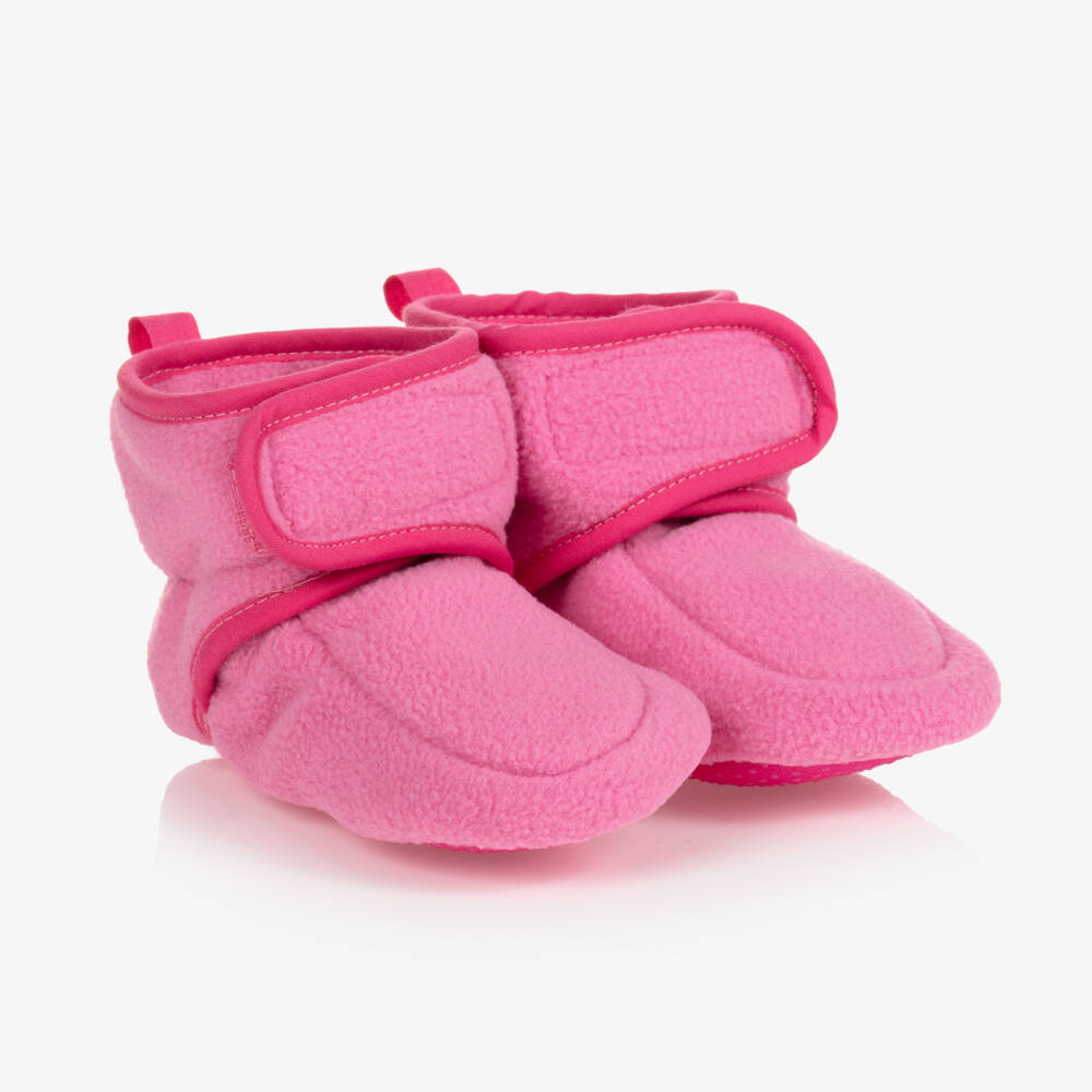 Pink booties for baby girls by Playshoes. They are made in soft polar fleece on the inside and outside. Comfortable and easy to wear, they have double velcro fastenings with elasticated panels on the back to ensure they stay secured on little feet. The bottoms have tiny non-slip grips, making them ideal slippers or indoor boots.