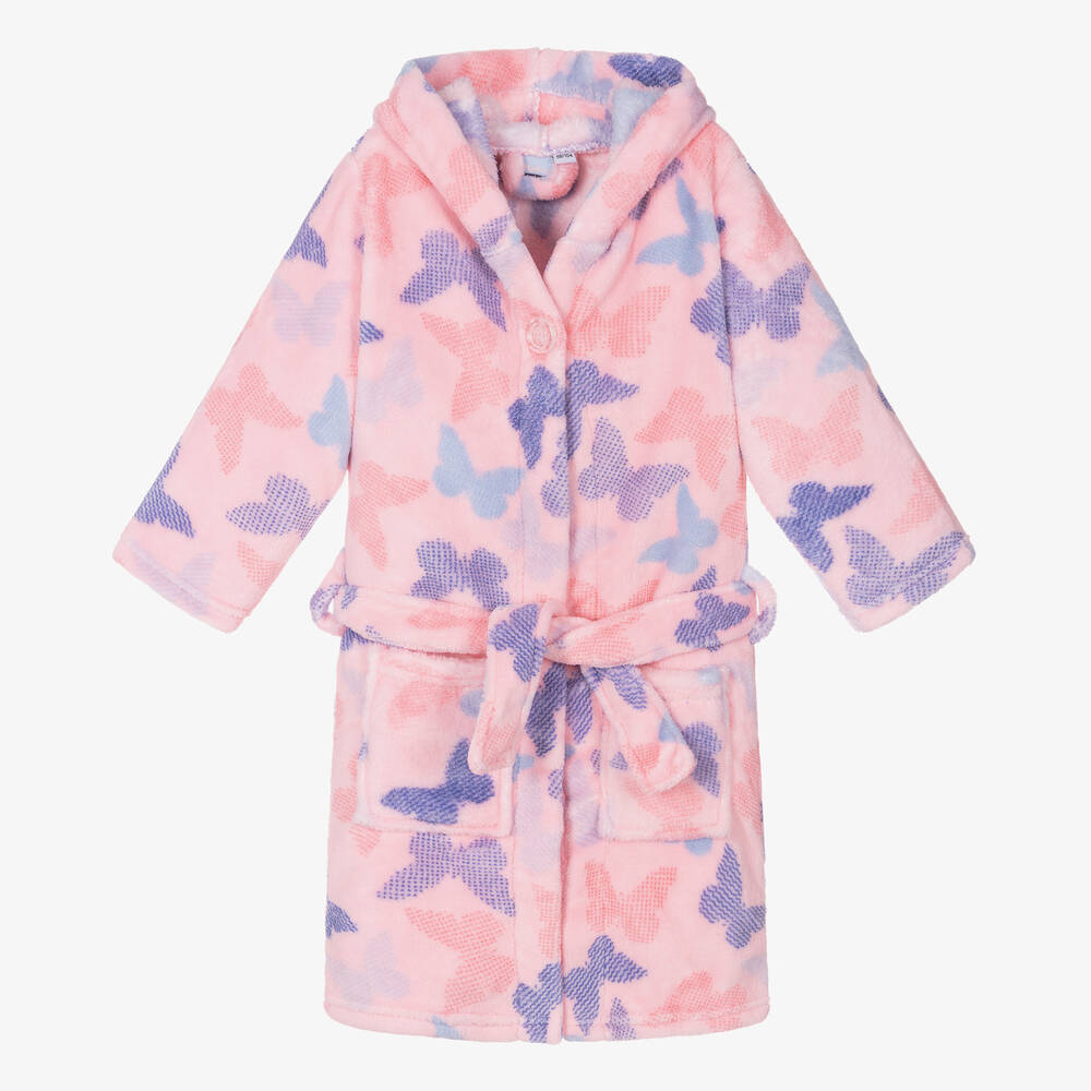 A pink dressing gown for girls by German brand Playshoes, patterned in pretty pink and blue butterflies. Cosy and comfy, it is made in soft fluffy fleece, with a fixed hood and two patch pockets on the front. It fastens with a large button at the top and has a detachable sash tie around the waist.