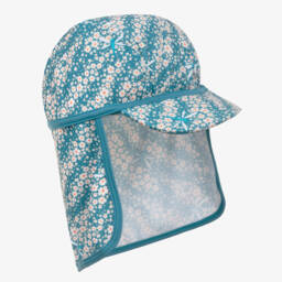 Blue sun protective swim hat for boys and girls by Playshoes, with a sun protection factor of 50+. Made in silky and stretchy lycra, it has orange stitching details and an under-the-sea print, with little blue and orange fish. This protective hat covers the ears and the back of the neck, and has a peaked front.