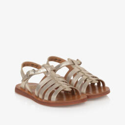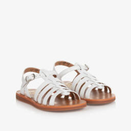 Lovely white leather sandals for girls by French footwear brand Pom d'Api. Stylish and comfortable for warm weather, this strappy design is lined in soft and supple leather with a tan brown leather insole. The rubber outer sole is flexible and textured with cute sea shells for added grip. They fasten with a silver buckle at the ankle for an adjustable fit.