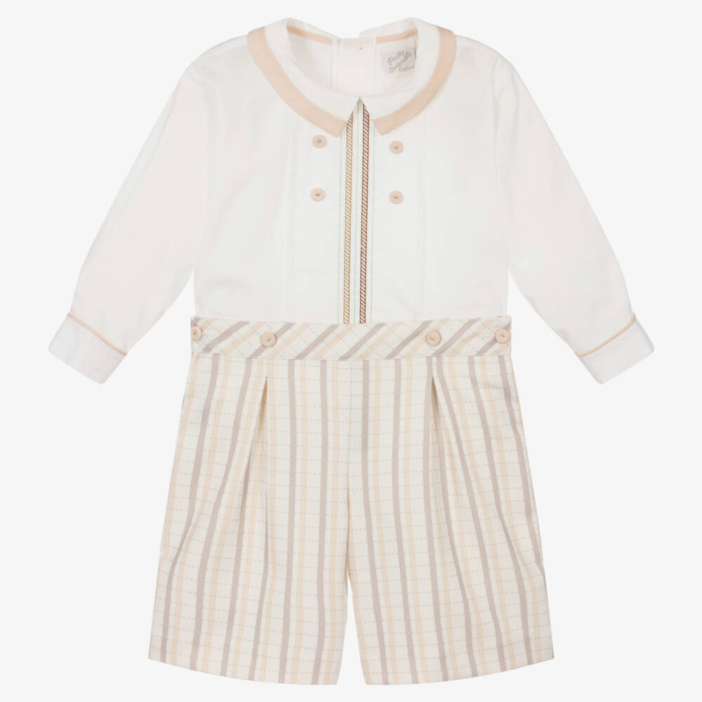 A ivory and beige shorts set for little boys by traditional British brand, Pretty Originals. Made from soft and lightweight cotton, the shirt is embroidered in shimmery gold thread with green stripes. The beige-trimmed collar and decorative buttons on the chest add neatness to this smart style. It has pearlescent button fastenings on the back. Fastening onto the shirt with buttons are a pair of silky shorts, which are patterned in coordinating beige and green stripes. They button-up at the sides, and are gently elasticated for comfort.