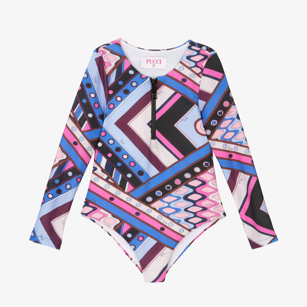 Striking long-sleeved swimsuiit for girls by luxury Italian band PUCCI. Silky smooth and stretchy, it is patterned with the designer's signature Vivara print in shades of pink and blue. Fully lined for comfort, it has a stylish black zip fastening on the front.