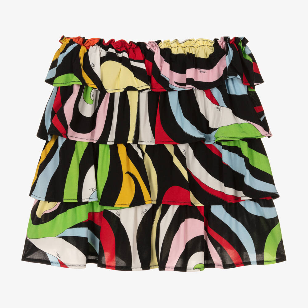 As seen in the main collection from Italian brand Emilio Pucci, black skirt patterned with a colourful Marmo print for teen girls. Silky smooth and lightweight, this beautiful skirt has layered tiers for a feminine silhouette and an elasticated waist for comfortable, easy wear.