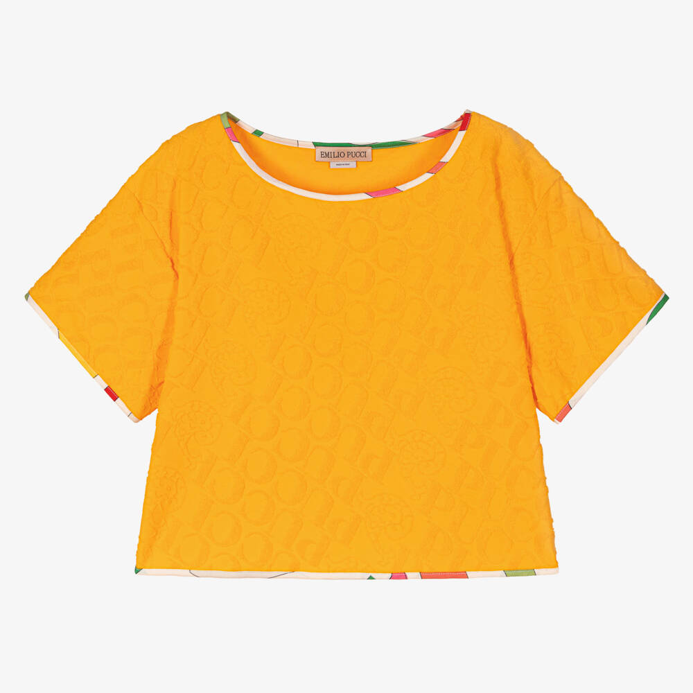 From luxury brand Emilio Pucci, deep yellow T-shirt for teen girls with flocked jacquard logos and Pesci motifs for a subtle designer touch. This lovely cropped boxy top has trims of Marmo print synonymous with the brand for a fun finish. The cotton-blend jersey material is cool and comfortable to wear.