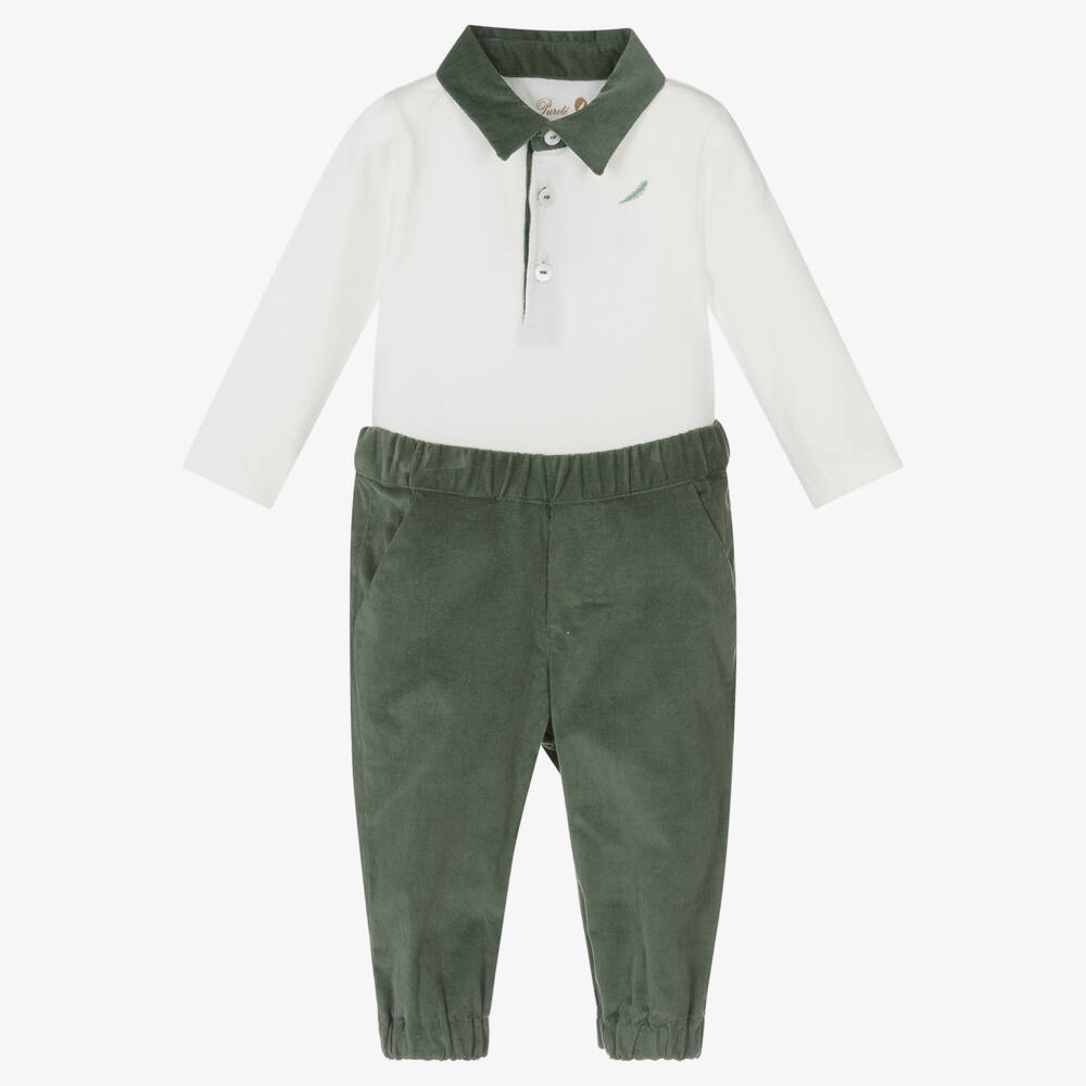 Lovely for a smart occasion, this cotton trouser set for baby boys is by Pureté Du... Bébé. The green trousers are made in fine corduroy, with the waist and ankle cuffs comfortably elasticated. The ivory bodysuit is made in soft jersey and has a pointed collar in matching green corduroy. Button fastening on the chest, it has poppers between the legs to ensure it remains neatly tucked in.
