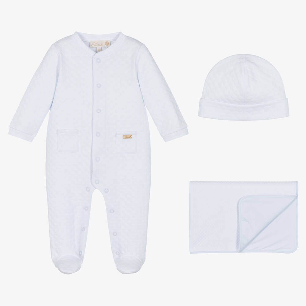 Pale blue cotton babysuit set for boys and girls by Pureté Du... Bébé, made in soft jersey with a delicate diamond pattern. The babygrow has little patch pockets on the front, with easy-fastening poppers on the front and between the legs. The hat has a cute turned up brim, and the double-layered blanket is decorated with a sweet ribbon bow and mother of-pearl logo charm. Both the hat and babygrow are trimmed with a beige logo tab.