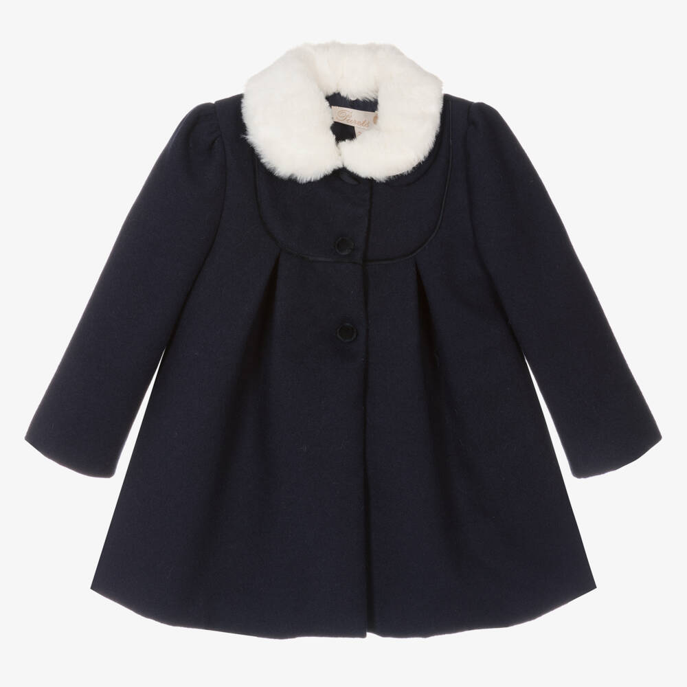 A traditionally styled navy blue coat for little girls from Pureté du... Bébé, made in beautifully soft and warm felted fabric. Styled with soft pleats, it has an understated velvet trim, velvet-covered buttons and a sweet velvet bow on the back. Secured with buttons, the detachable ivory faux fur collar adds a contrasting element to this classic piece. For comfort, it has a silky lining.