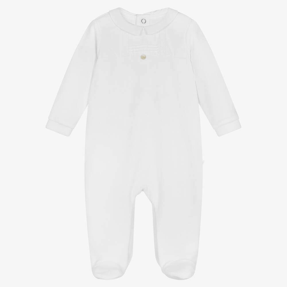 Adorable white babygorw for boys and girls by Pureté Du... Bébé, made in beautifully soft cotton velour. It has a white woven collar and chest panel, with lace trim and pintuck pleats. There is a sweet mother-of-pearl logo charm on the front and a branded tab on the side seam for a subtle designer touch. This lovely babygrow fastens with poppers on the back and between the legs.