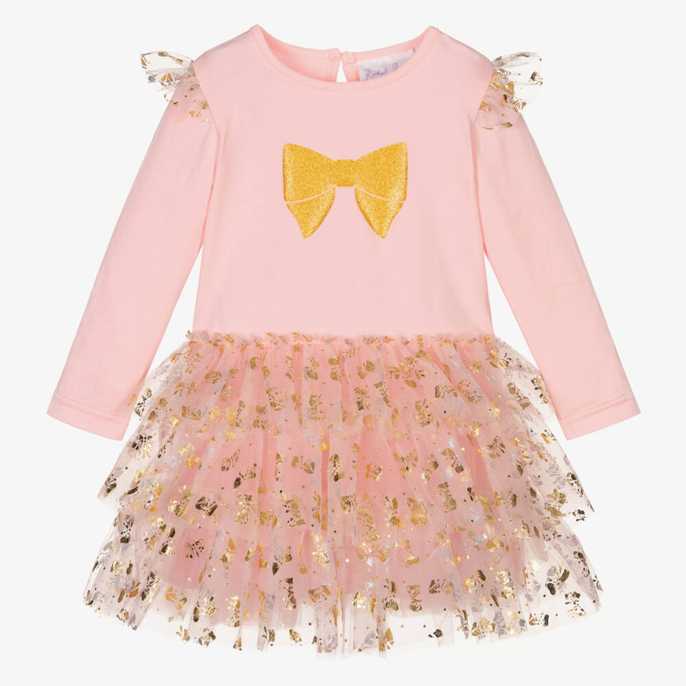 Pretty and feminine, a pink tutu dress for baby girls by British brand Rachel Riley. Lined in comfortable cotton, the skirt is made with layers of soft tulle, patterned with metallic gold bows. Fastening with a single back button, the soft jersey bodice has a glittery gold bow printed on the front, with matching tulle ruffles over the shoulders.