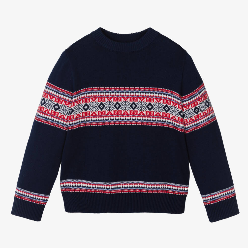 A navy blue sweater for boys by British brand Rachel Riley, knitted in soft and lightweight cotton. Traditionally styled, this crew neck jumper has a red Fair Isle design.