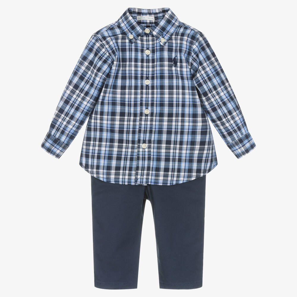 Boys shirt and trousers set by Ralph Lauren. The blue striped shirt is made in smooth cotton poplin and has blue polo logo embroidery and front button fastenings. The matching navy blue trousers are made in cotton twill and have an elasticated waistband and front button fastening.