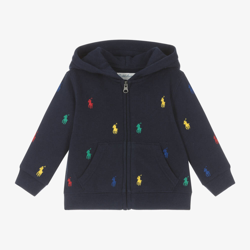 A dark navy blue zip-up top for baby boys by Ralph Lauren, with little front pockets. This long-sleeved hoodie is made in soft and comfortable jersey with a cosy fleece underside. Signed with branding, the fabric features colourful pony logo embroidery for instant designer recognition. Quick and simple to dress baby, it fastens with a smooth front zip.