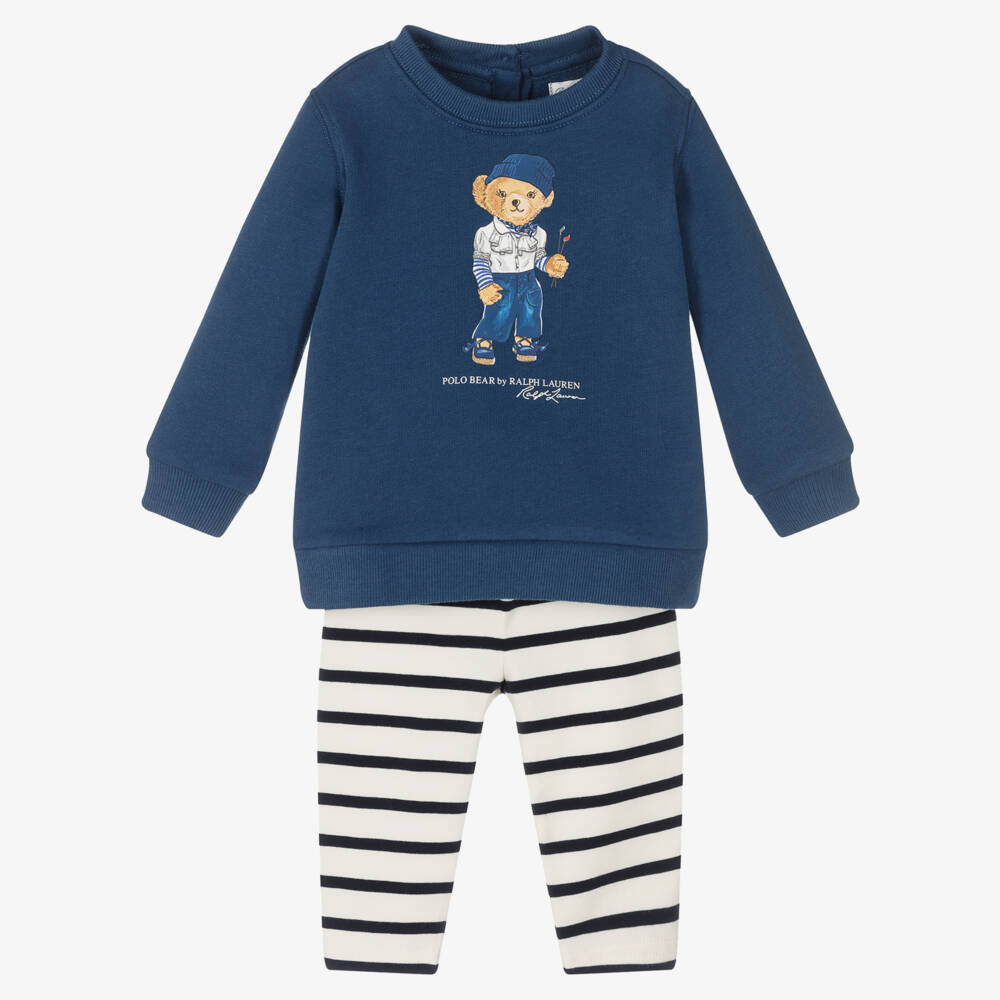 Navy blue and white leggings set for baby girls by American brand Ralph Lauren, made in the softest cotton jersey. The sweatshirt is patterned with the signature Polo Bear holding paintbrushes and has a comfortable fleecy underside and useful button fastenings on the back. The striped leggings have the signature pony logo embroidered in navy blue horseman logo and an elasticated waistband.
