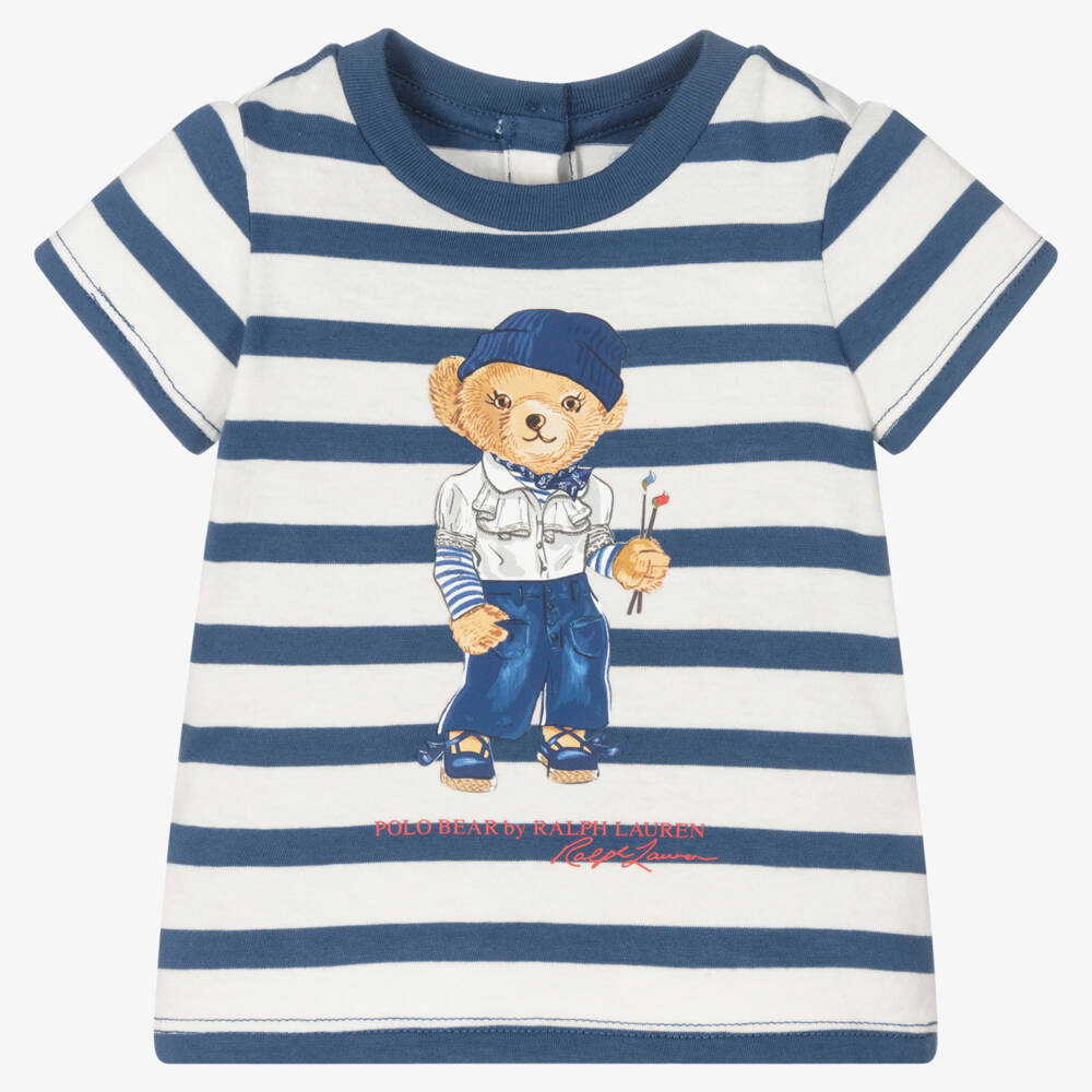 Blue and white striped cotton T-shirt for baby girls by American brand Ralph Lauren, made in all-day comfortable, stretchy jersey. It has the designer's beloved bear with an artist-inspired look printed on the front, with a red logo below. It fastens with buttons around the back.