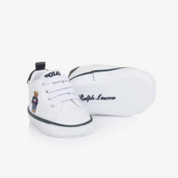 These gold pre-walker trainers by Ralph Lauren are a charming choice for baby girls. With a dazzling glitter finish, they feature an embroidered Pony logo on the side and a branded, metallic gold heel panel. Lined in soft mesh, they have a gently padded insole and a flexible faux leather outer sole. Elasticated laces make dressing simple, while the velcro strap ensures a secure fit.