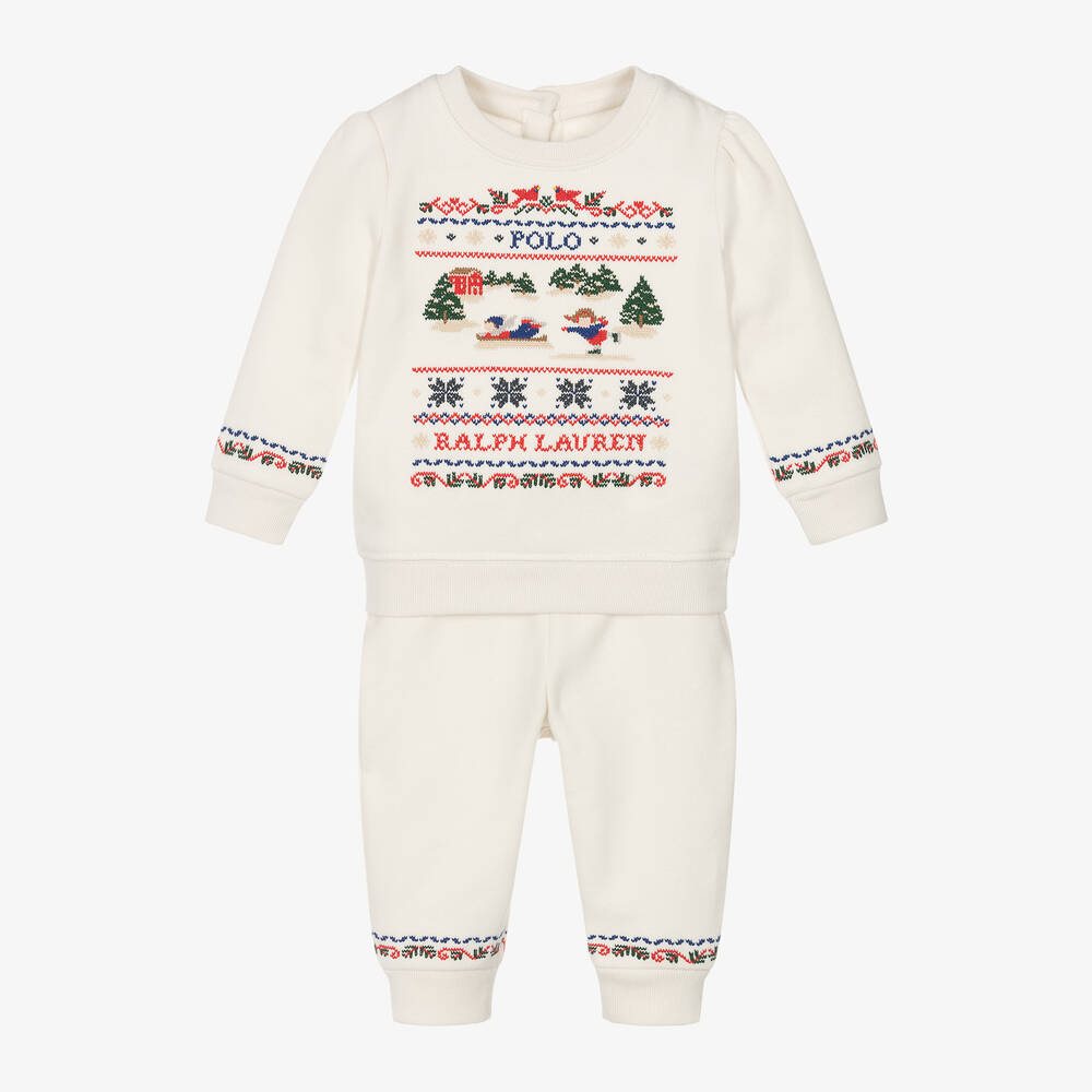 An ivory tracksuit for baby girls by Ralph Lauren, made in mid-weight cotton-blend jersey with a soft, fleecy inside. Featuring the designer's iconic logo, the top is embroidered with a charming festive design in red, blue and green. It has puffed sleeves and fastens with buttons on the back. The joggers have a gently elasticated waistband for a comfortable fit.
