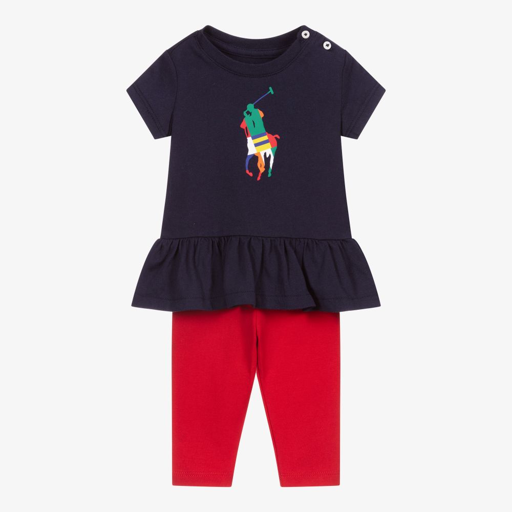 Navy blue T-shirt and red leggings set for baby girls by Ralph Lauren, made with soft and stretchy cotton jersey. The top has a pretty frilled hem, shoulder button fastenings, and a colourful Big Pony logo print. The red leggings have a comfortable, elasticated waist, and the signature pony logo, embroidered in navy blue.