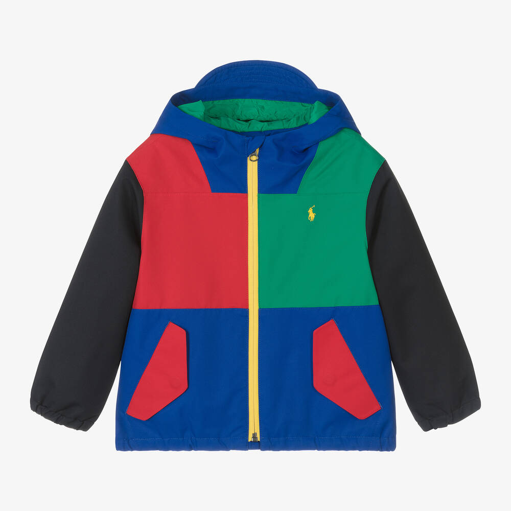 A vibrant colourblock jacket for boys by Ralph Lauren, made in a smooth and lightweight recycled fabric. Designed to protect your little one on rainy days, this jacket has a water repellent exterior and a hood with a peak. It has a bright yellow zip fastening and a signature pony logo embroidery, with pockets that close using poppers. This versatile piece can be worn alone or zipped into a functional P-Layer 1 item for added warmth.
