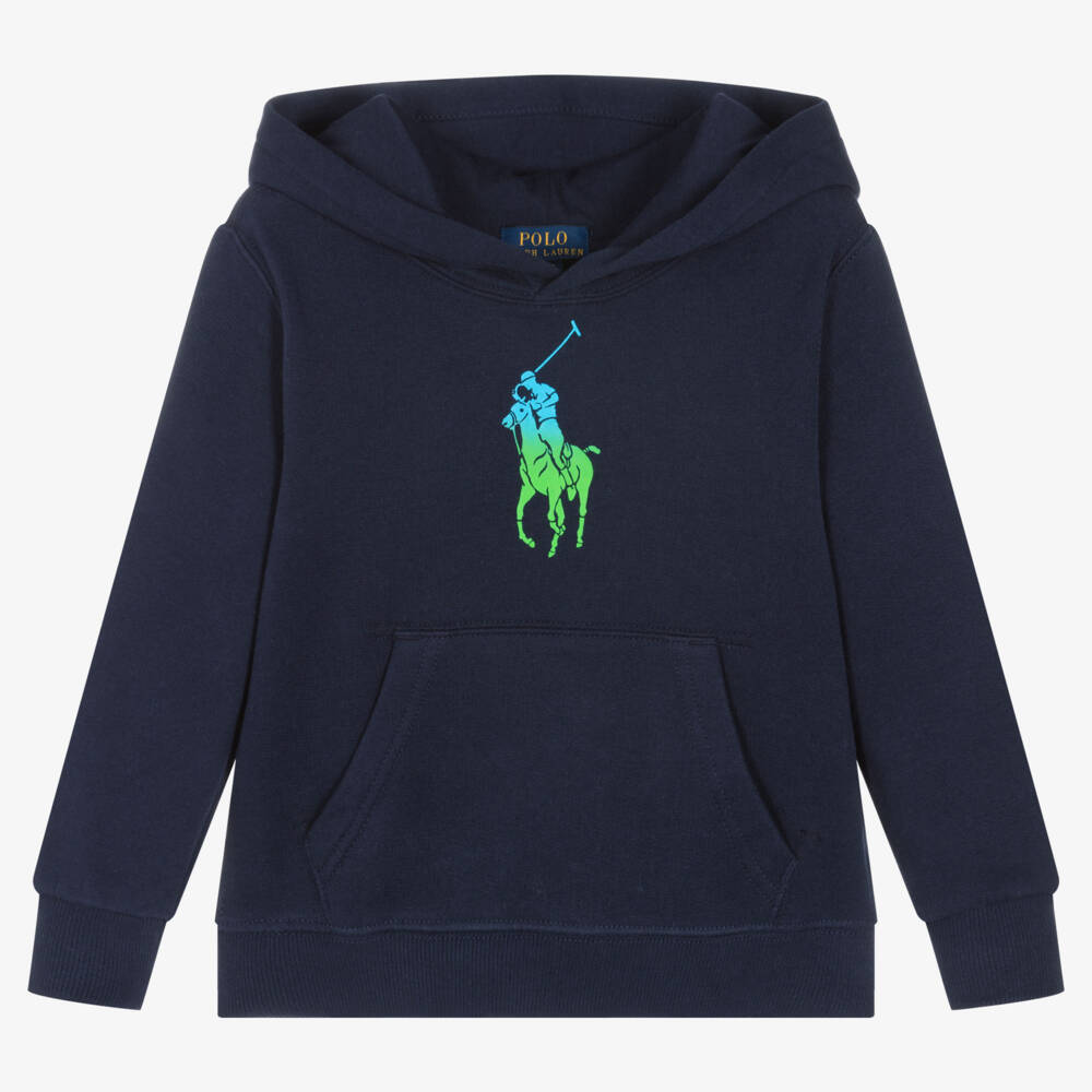 Navy blue hoodie for boys by Polo Ralph Lauren, made in mid-weight cotton sweatshirt jersey, with a fleecy inside. Comfortable to wear, it has a pouch pocket on the front and the brand's signature Big Pony logo printed in blue and green above.