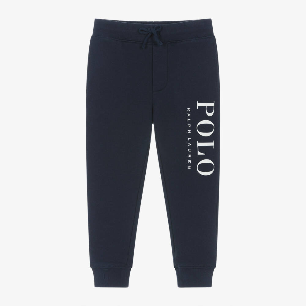 Sporty navy blue cotton joggers for boys by American brand Ralph Lauren, with a shout-out white logo printed on one leg. Endlessly comfortable, they are made in soft, comfortable, cotton-blend jersey, with a drawstring waist for a good fit and useful side seam pockets. The designer's signature pony logo is embroidered in white on the back pocket.