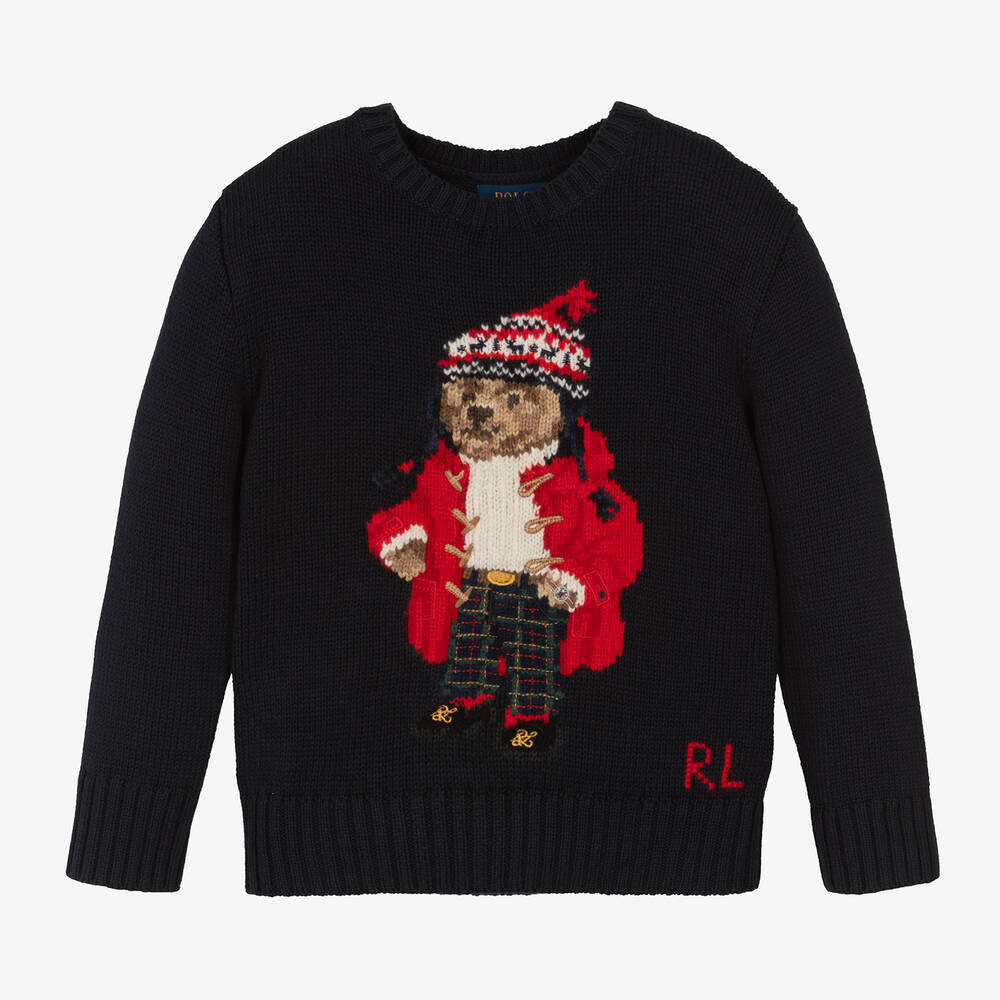 Navy blue chunky-knit cotton sweater for boys by Ralph Lauren. Cosy and comfortable, it features the designer's beloved Polo Bear on the front, dressed for cold weather conditions. Adding a finishing designer touch, the RL logo can be seen at the hem.