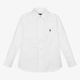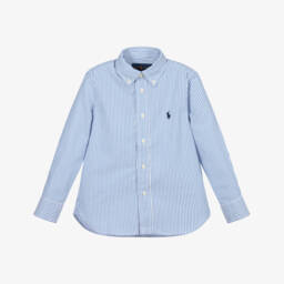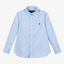 Blue slim fit shirt for boys by American brand Polo Ralph Lauren. It is made in comfortable, lightweight cotton poplin with a button-down collar and adjustable cuffs. The designer's signature pony logo embroidered in navy blue on the chest.