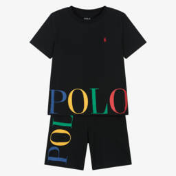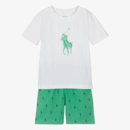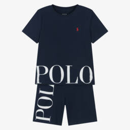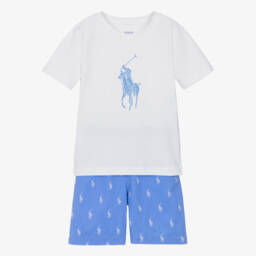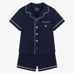 Blue cotton short pyjamas for boys by Ralph Lauren, patterned with the brand's signature pony logo for instant designer appeal. Lightweight and comfortable, the classic-styled top has short sleeves and a patch pocket on the chest. It fastens with branded buttons, whilst the matching shorts have a cool, navy blue and white elasticated logo waistband.