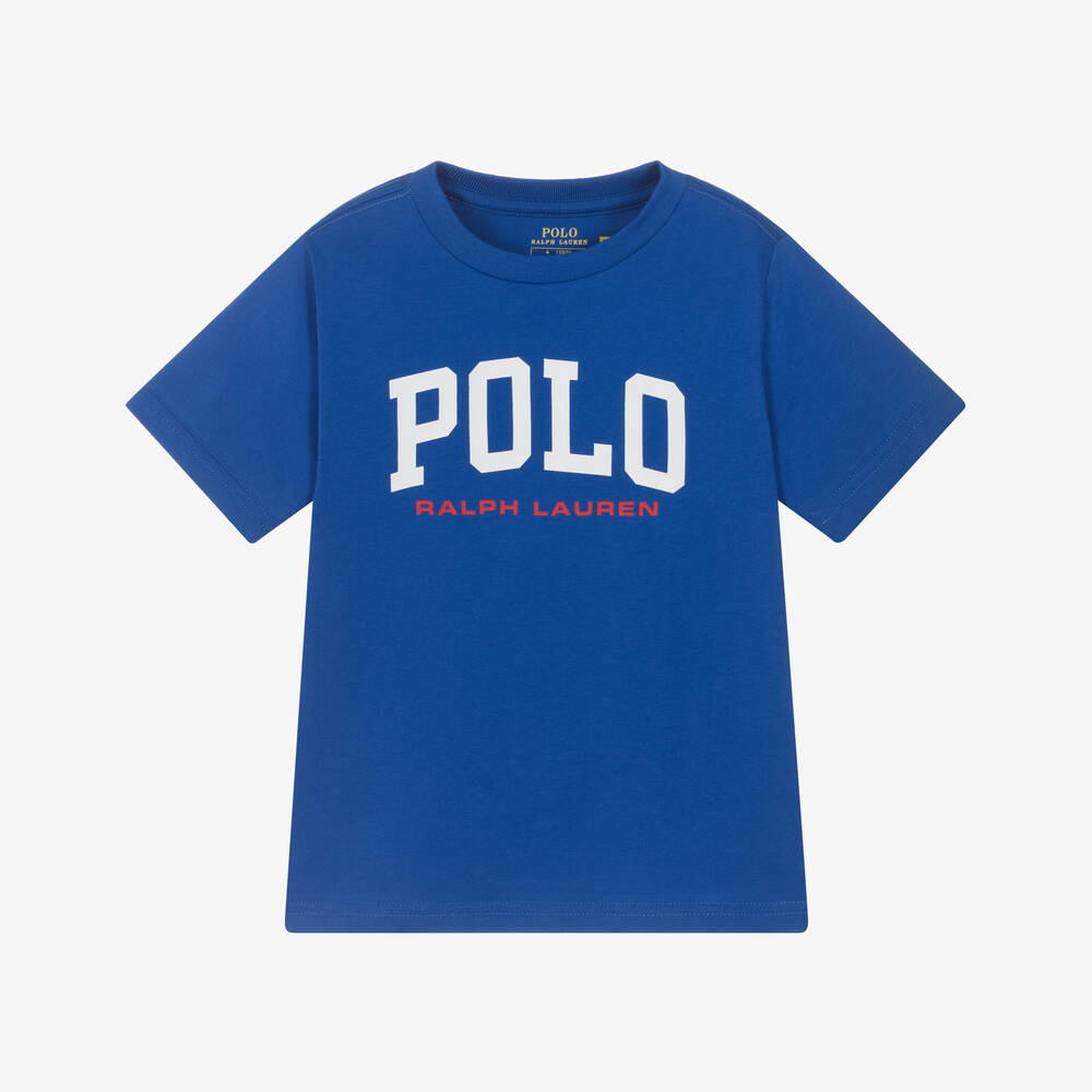 Boys blue cotton T-shirt by Ralph Lauren. This wardrobe staple has a varsity-inspired Polo logo on the front for an instantly recognisable look.