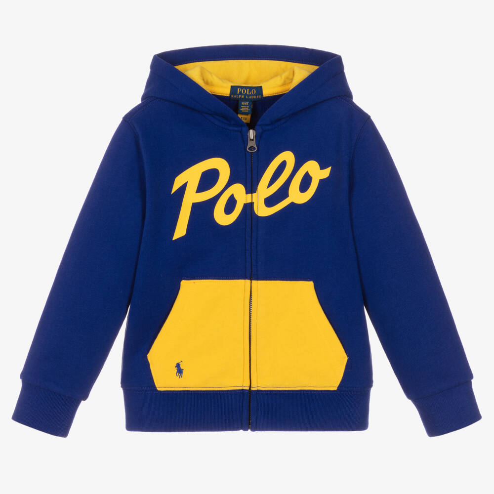 Blue zip-up hoodie for boys by Ralph Lauren, made in mid-weight cotton-blend jersey. For a fun twist on a classic item, the front pouch pocket is contrasting yellow to match the large script logo print across the chest. For an extra designer touch the brand's signature pony logo is embroidered on the front.