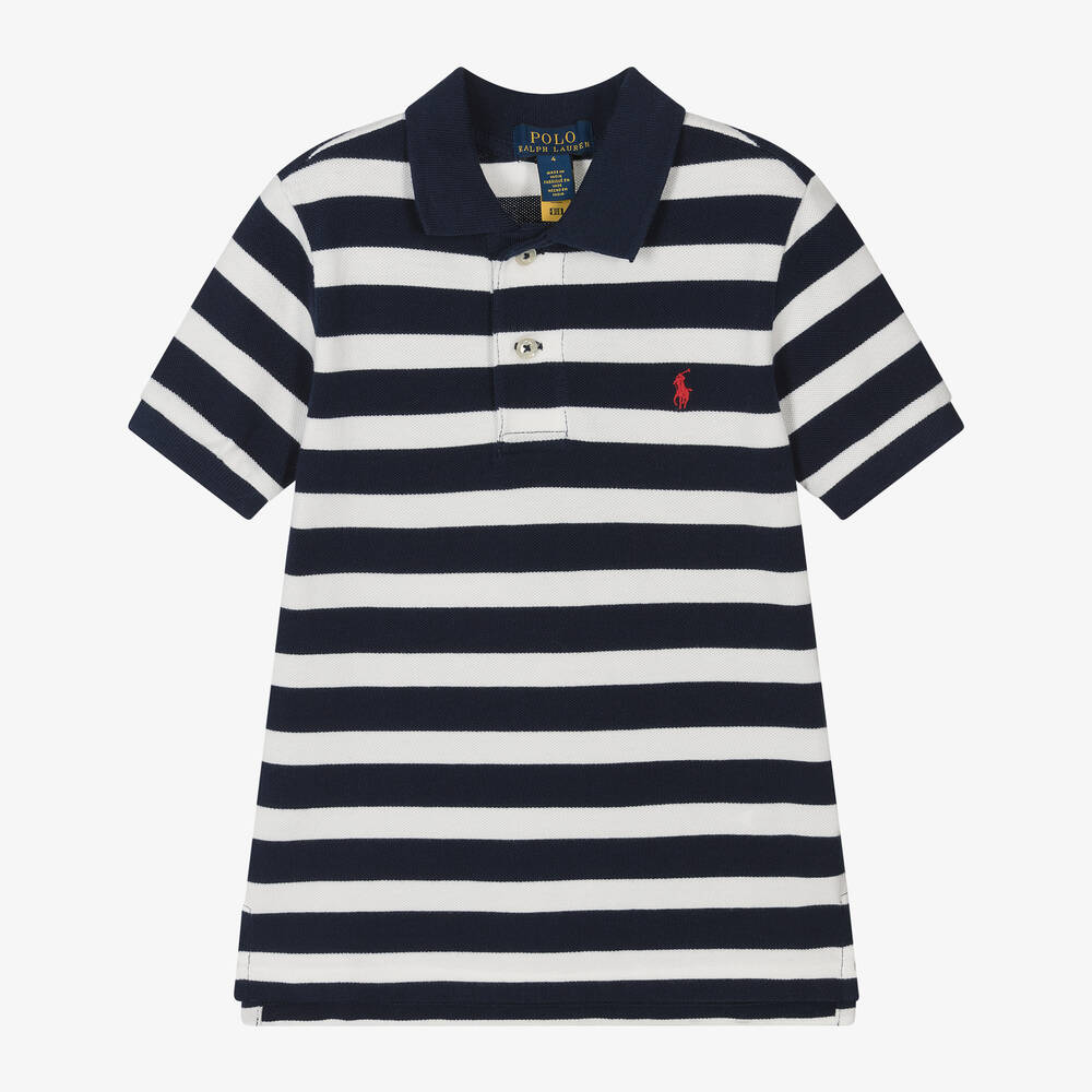 Navy blue and white striped polo shirt for boys by Ralph Lauren, made in soft cotton piqué. Classically styled with short sleeves and a ribbed collar, it has front button fastenings and the brand's signature pony logo embroidered on the chest in red. It has a stylish split hem for a comfortable fit.